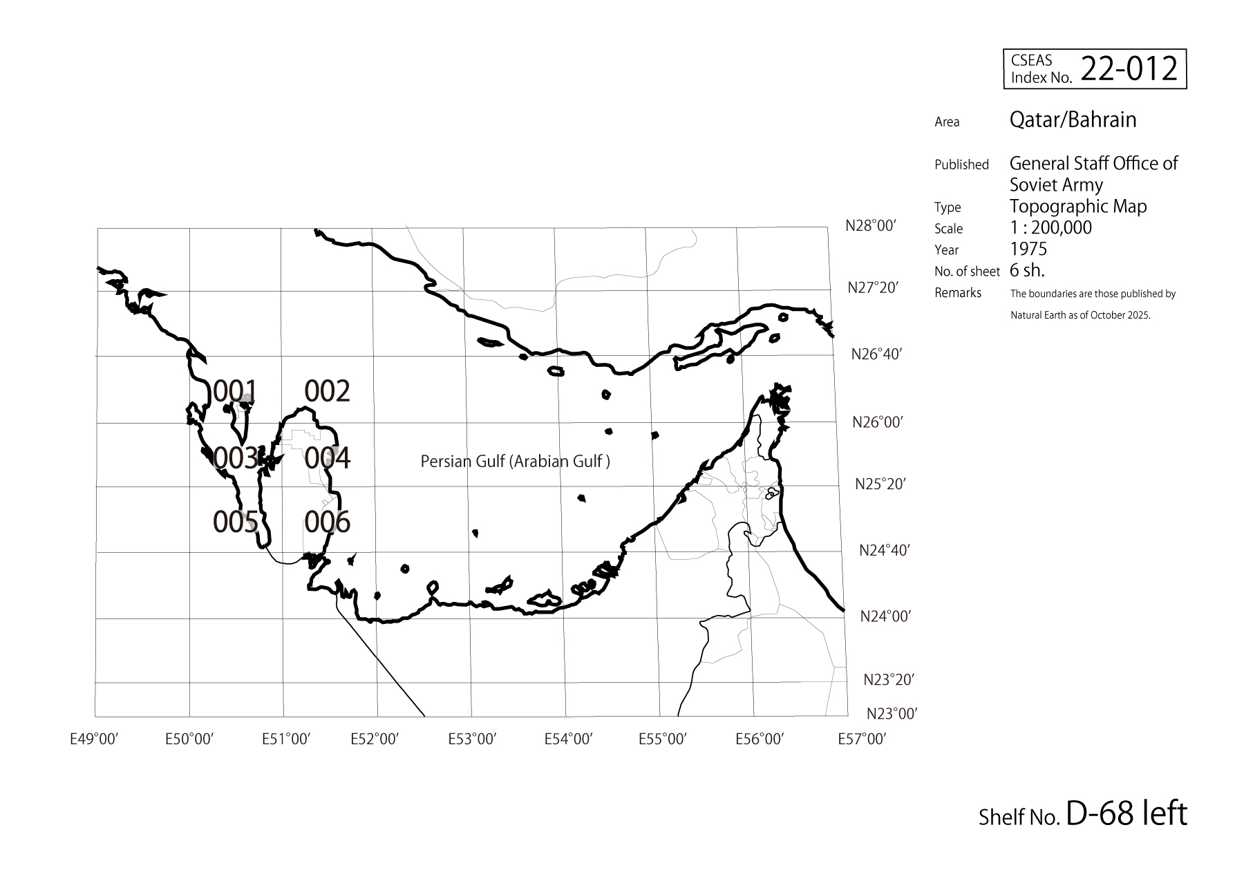 Central Asia, Southwest Asia22-012 Index No.22-012CountryQatar / BahrainAreaQatar / BahrainPublisherGeneral Staff Office of Soviet ArmyTypeTopographic MapScale1:200,000Year1975Number of sheet6